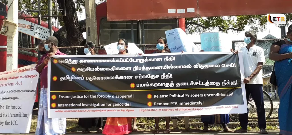 இதன்போது போராட்டத்தில் ஈடுபட்டவர்கள், வலிந்து காணாமல் ஆக்கப்பட்டோருக்கான நீதி!, அரசியல் கைதிகளை நிபந்தனையில்லாமல் விடுதலை செய்!, பயங்கரவாத தடைச்சட்டத்தை நீக்கு, சர்வதேசமே நாம் அழுவது கேட்கவில்லையா? வேண்டும் வேண்டும் சர்வதேச விசாரணை வேணடும்., தமிழரின் படுகொலைக்கு அனைத்துலக விசாரணை வேண்டும்., எங்கே எங்கே உறவுகள் எங்கே? உள்ளிட்ட பதாதைகளை ஏந்தியவாறும் கோசங்களை எழுப்பியவாறும் போராட்டத்தை முன்னெடுத்திருந்தனர்.