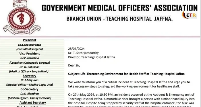 யாழ்ப்பாணம் போதனா வைத்தியசாலை ஊழியர் தாக்கப்பட்ட சம்பவம் தொடர்பாக உரிய நடவடிக்கை எடுக்குமாறு கோரி அரச வைத்திய அதிகாரிகள் சங்கம் வைத்தியசாலைப் பணிப்பாளருக்கும் வட மாகாண ஆளுநருக்கும் அவசர கடிதமொன்றை அனுப்பி வைத்துள்ளது.