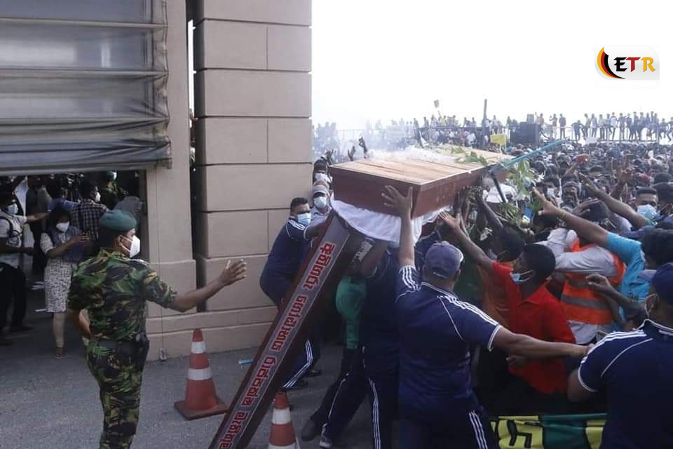 நேற்று இடம்பெற்ற ஆர்ப்பாட்டத்தில் கலந்து கொண்ட மக்கள் ஜனாதிபதி செயலகத்தினுள் சவப்பெட்டியை வீசியுள்ளனர். ஆர்ப்பாட்டக்காரர்கள் காலி வீதி ஊடாக ஜனாதிபதி செயலகம் வரை சென்று செயலகத்தினுள் சவப்பெட்டியை வீசியுள்ளனர்.