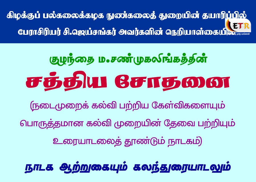 1984ஆம் ஆண்டளவில் குழந்தை ம.சண்முகலிங்கத்தால் எழுதப்பட்ட இந்நாடகம் அப்போது கலாநிதி க.சிதம்பரநாதனது நெறியாள்கையில் பல அரங்குகள் கண்டிருந்தது. 40 வருடங்கள் கழித்து இந்நாடகம் மீண்டும் மேடையேற்றப்பட்டுள்ளமை முக்கியமானதாகும். இந்த நாடகம் நடைமுறைக் கல்வி தொடர்பான விமர்சனங்களை முன்வைத்து கேள்வி எழுப்புவதுடன் பொருத்தமான கல்விமுறையின் இன்றியமையாமை தொடர்பில் சிந்தனைத் தூண்டலை ஏற்படுத்துவதாக ஆக்கப்பட்டுள்ளது.