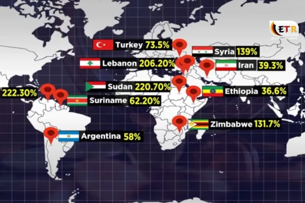 ருவாண்டாவில் உணவுப் பணவீக்கம் 65 சதவீதமாகக் காணப்படுகின்றது. ஒன்பதாவது இடத்தில் தென் அமெரிக்க நாடான சுரினாம் காணப்படுவதுடன், ஹங்கேரி 44 சதவீத உணவுப் பணவீக்கத்துடன் 10ஆவது இடத்தில் காணப்படுகின்றது.