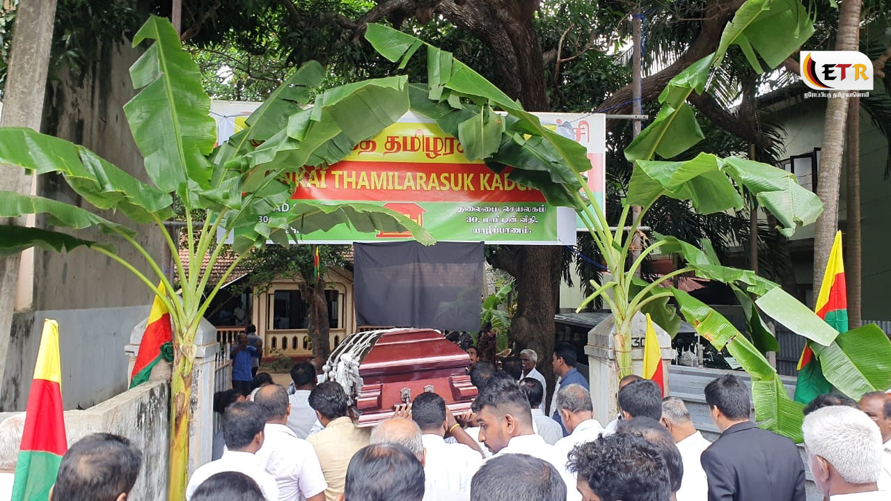 இதன்போது சம்பந்தனின் பூதவுடலுக்கு இலங்கை தமிழ் அரசுக் கட்சியின் கொடி போர்த்தப்பட்டு மாலை அணிவித்து அஞ்சலி செலுத்தப்பட்டது.