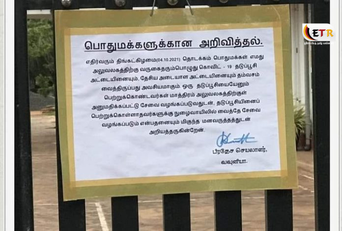 வவுனியா பிரதேச செயலகத்தினுள் சேவை பெற வருவோர் அடையாள அட்டையையும் , தடுப்பூசி அட்டையையும் கைவசம் வைத்திருக்க வேண்டும் என்றும் , தடுப்பூசி பெற்றுக்கொள்ளாதோர் பிரதேச செயலகத்தினுள் அனுமதிக்கப்பட்ட மாட்டார்கள் என அறிவித்தல் ஒட்டப்பட்டுள்ளது.
