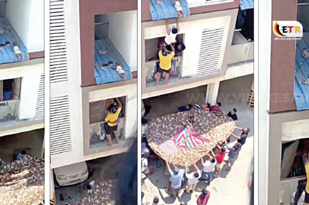 இதற்கிடையே, தகர கூரையில் தொங்கிக்கொண்டு இருக்கும் குழந்தையை பத்திரமாக மீட்பதற்கான முயற்சியில் குடியிருப்புவாசிகள் சிலர் இறங்கினர். உயிரை பணயம் வைத்து, முதல் தளத்தில் உள்ள ஜன்னல் வழியாக ஒன்றன்பின் ஒன்றாக இறங்கினர். ஒருவரை ஒருவர் பத்திரமாக பிடித்து கொள்ள, ஒருவர் துணிச்சலுடன் ஏறி, தகர கூரையின் நுனியில் தவித்துக் கொண்டிருந்த குழந்தையை லாவகமாக மீட்டார்.