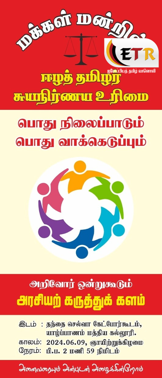 "பொது நிலைப்படும் - பொது வாக்கெடுப்பும்" நிகழ்வு எதிர்வரும் 09ஆம் திகதி ஞாயிற்றுக்கிழமை யாழ்ப்பாணத்தில் தந்தை செல்வா கேட்போர் கூடத்தில் மாலை 02.59 மணிக்கு நடைபெறவுள்ளதாக ஏற்பாட்டாளர்கள் அறிவித்துள்ளனர்.