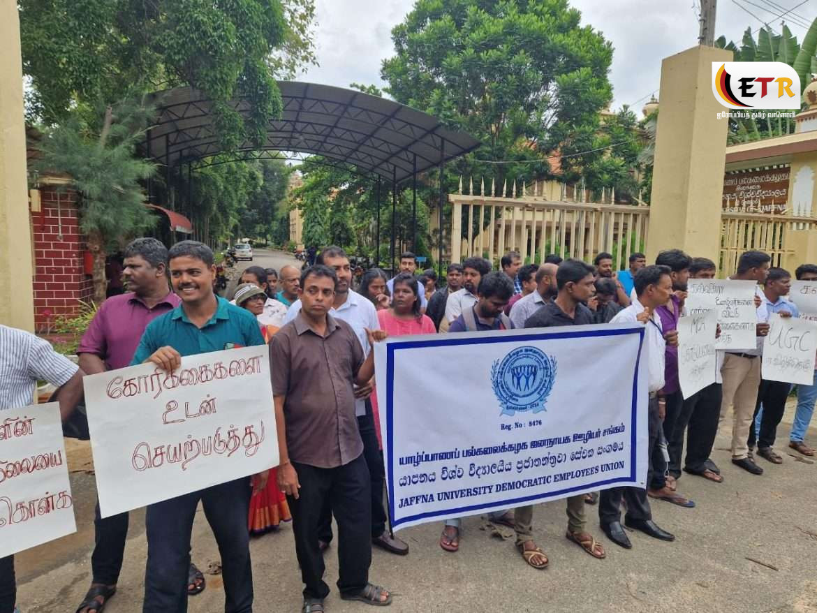 யாழ். பல்கலைக்கழக ஜனநாயக ஊழியர் சங்கத்தினா் போராட்டம்